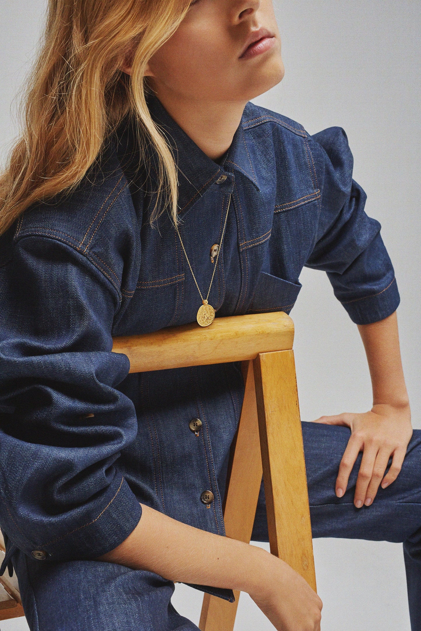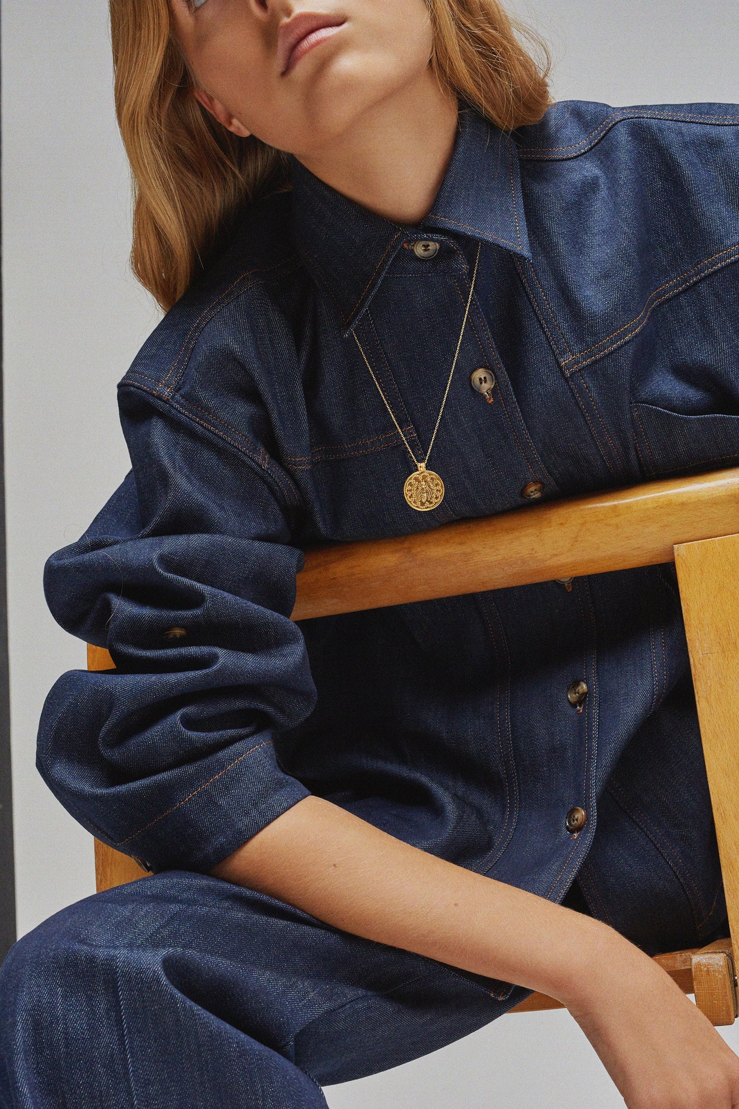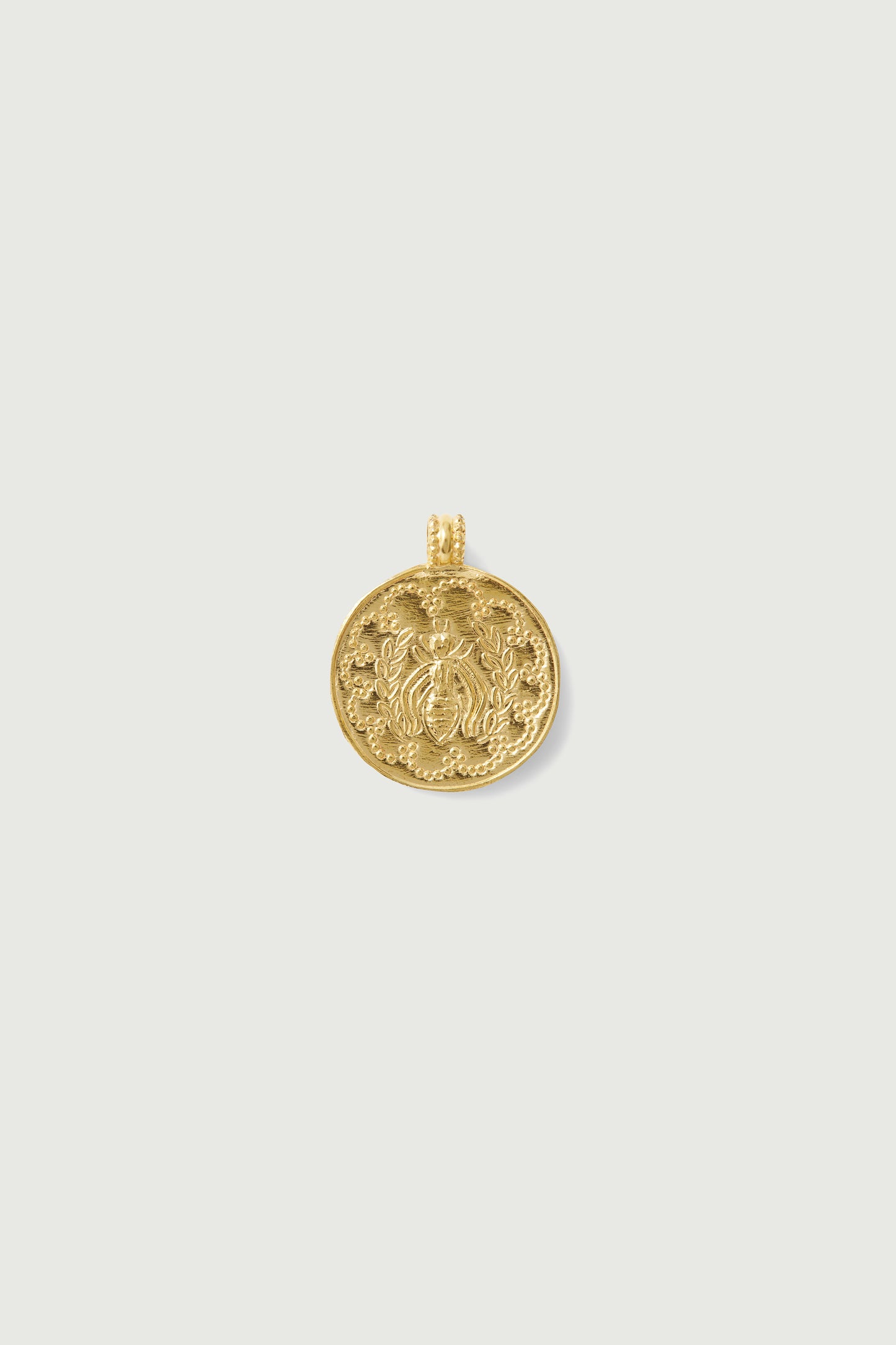 DOMITILLE 3 es un colgante redondo de vermeil decorado con una abeja. Los motivos del interior de la medalla están grabados a martillo.