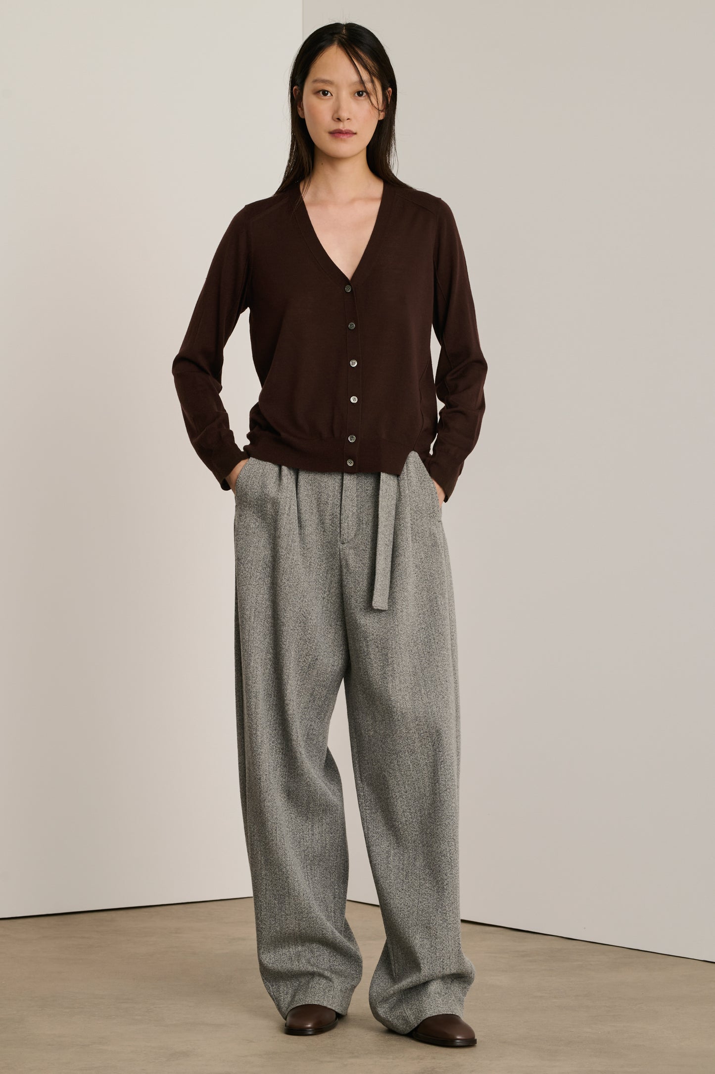 ALYSSA es un cárdigan holgado con un amplio escote en V. Está tejido en una lana merina extrafina para llevar directamente sobre la piel. La asimetría en la parte inferior del cuerpo, las disminuciones, los acabados de canalé y las costuras invertidas son detalles que enriquecen este cárdigan falsamente clásico.