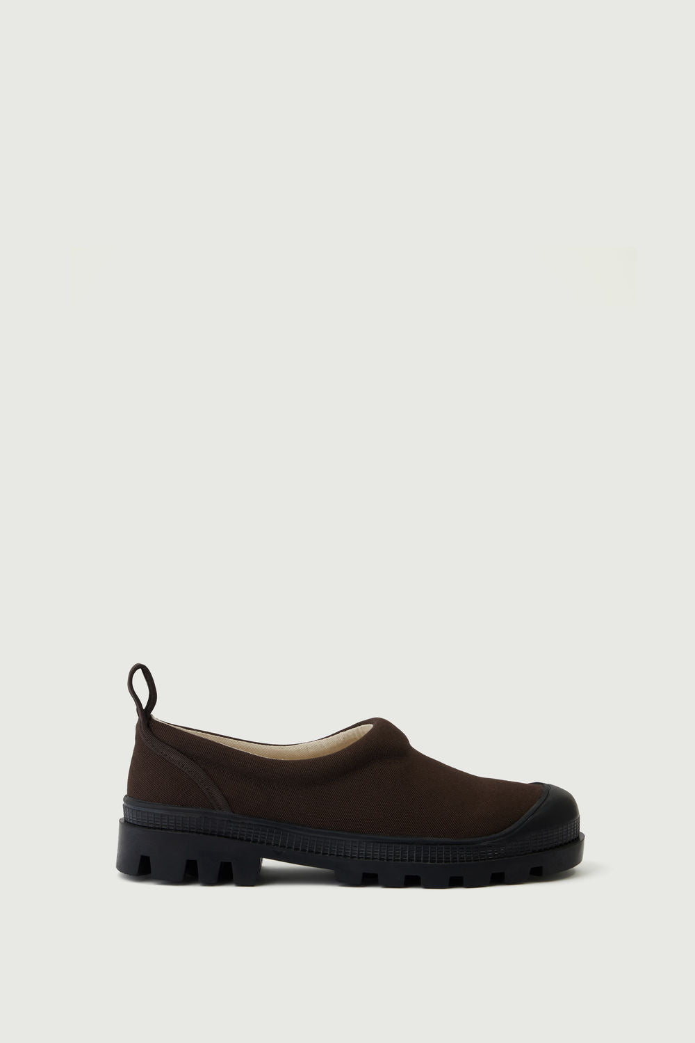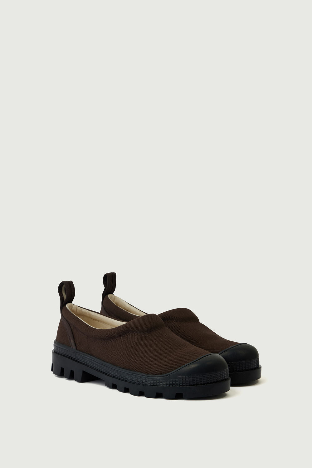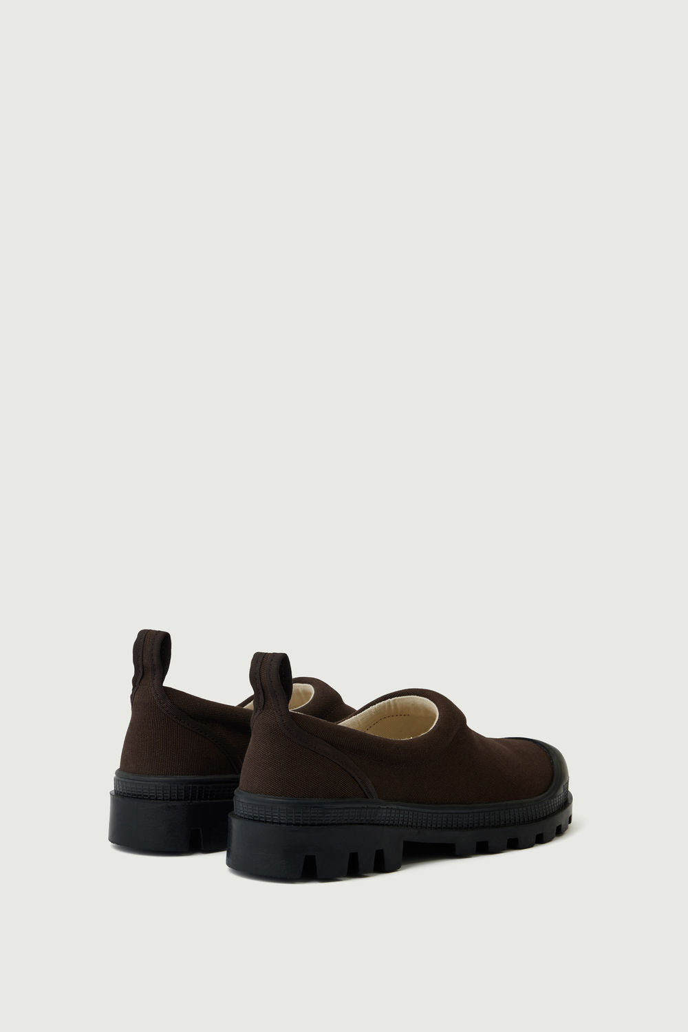 - Botines de lona marrón con suelas dentadas de caucho negro