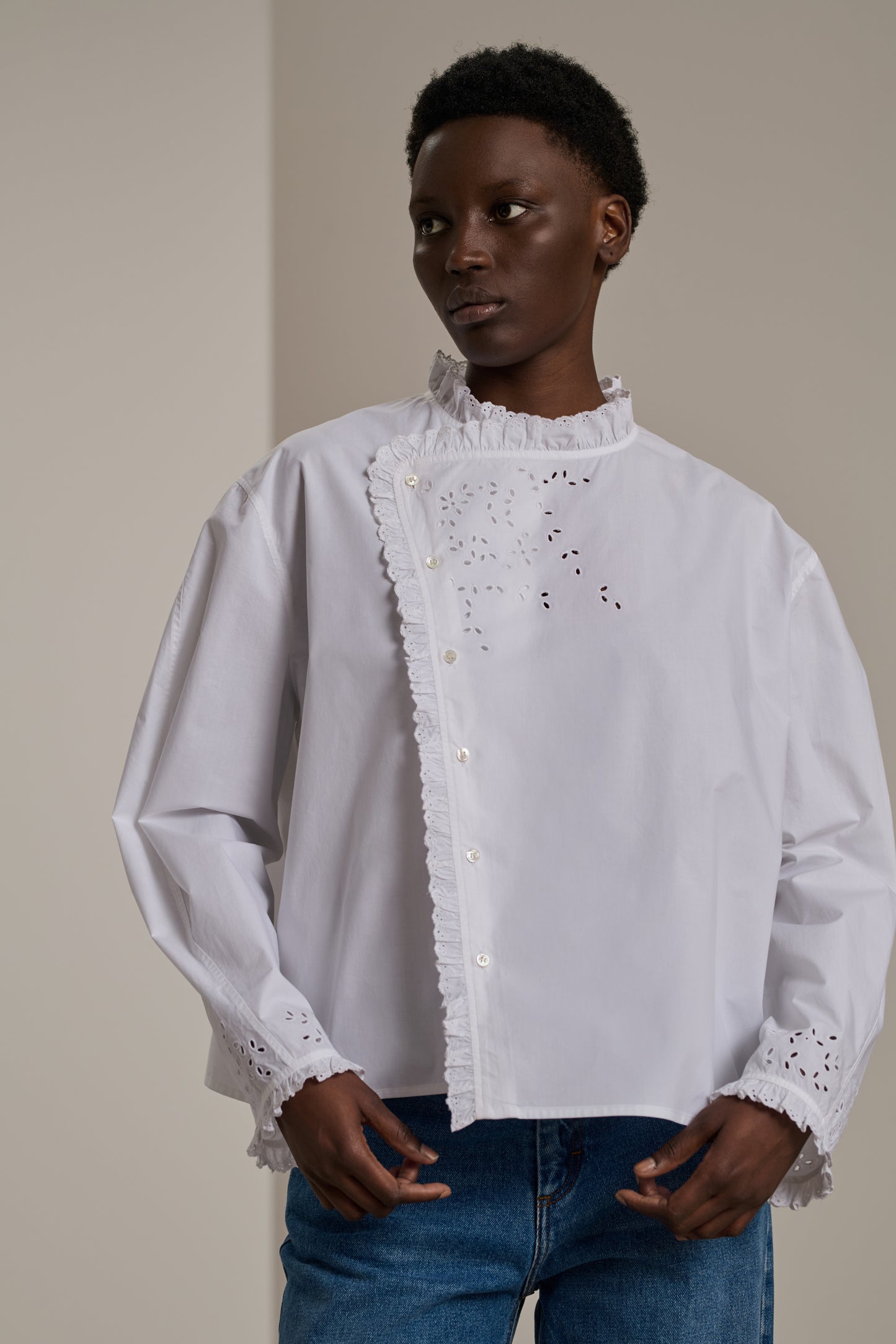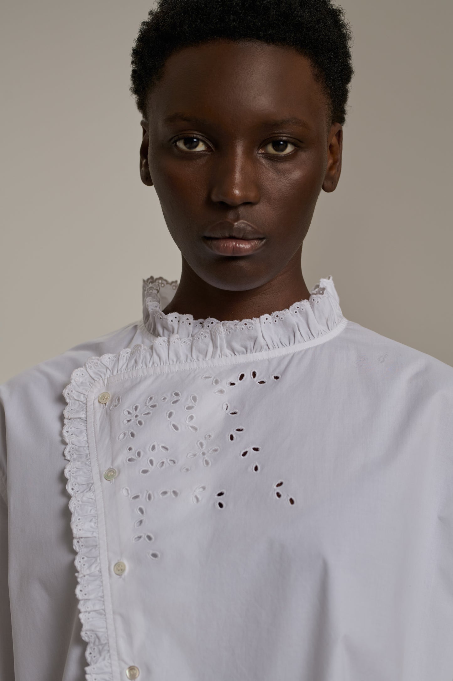 CLAUDIA es una camisa de popelina de algodón con corte recto. La apertura abotonada en el cuello, junto con una tira de botones decorativa, añade un toque distintivo y refinado, perfecto para realzar tus conjuntos diarios.