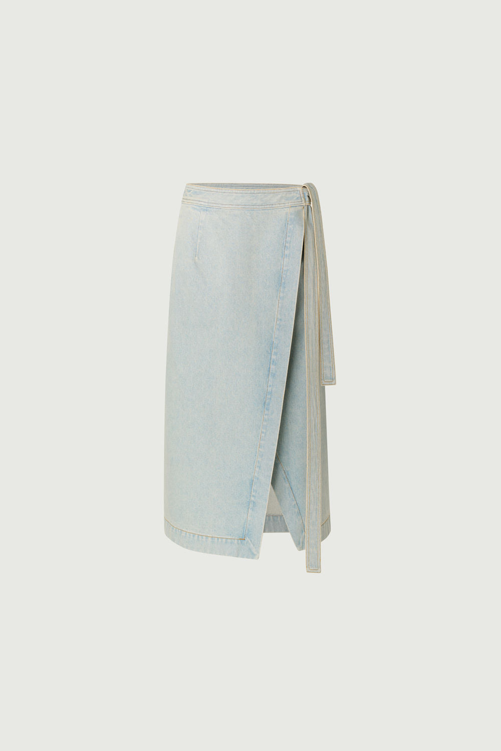 BLONDIE es una falda vaquera cruzada. Su corte elegante a media pierna realza la silueta al tiempo que ofrece una cómoda libertad de movimiento.