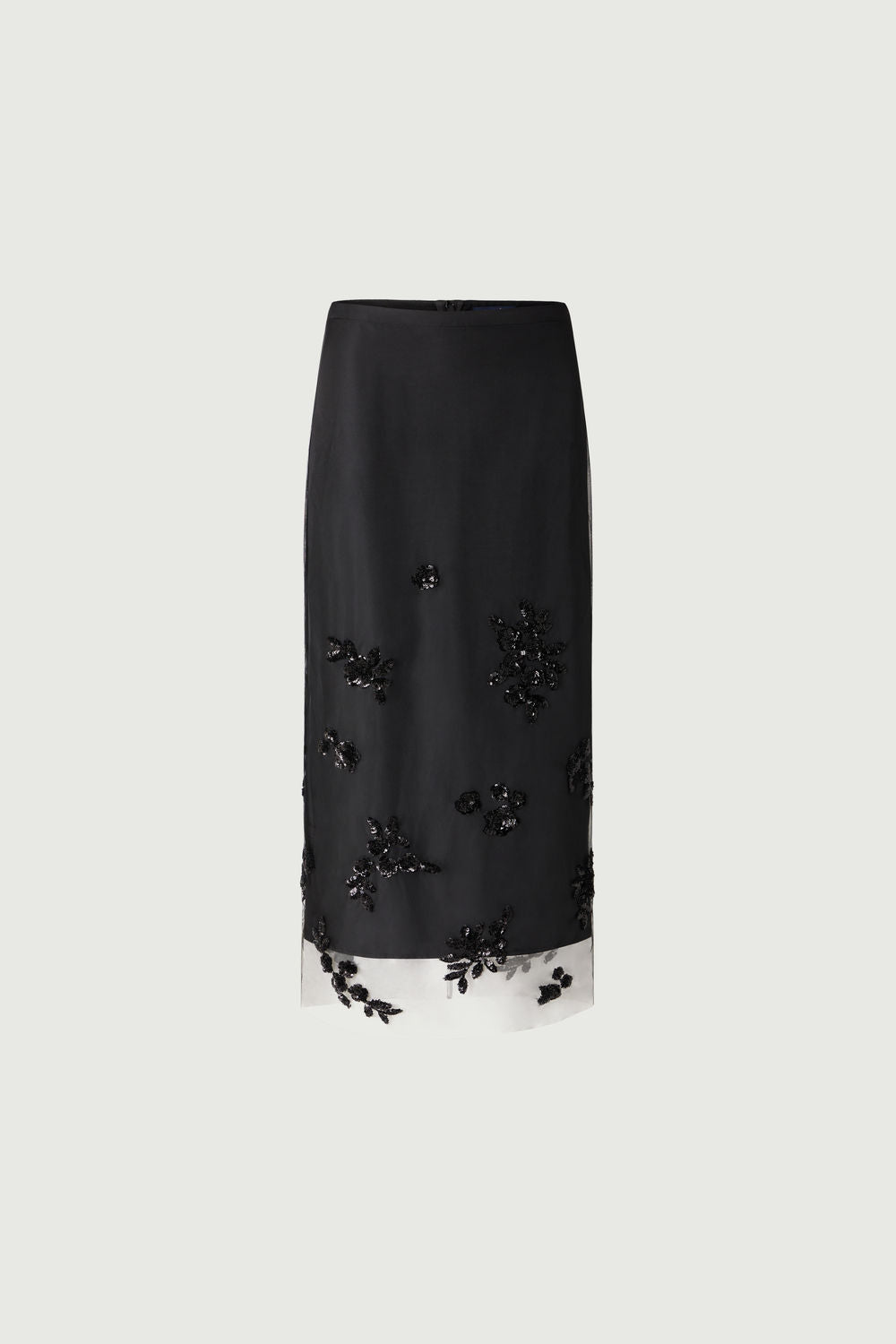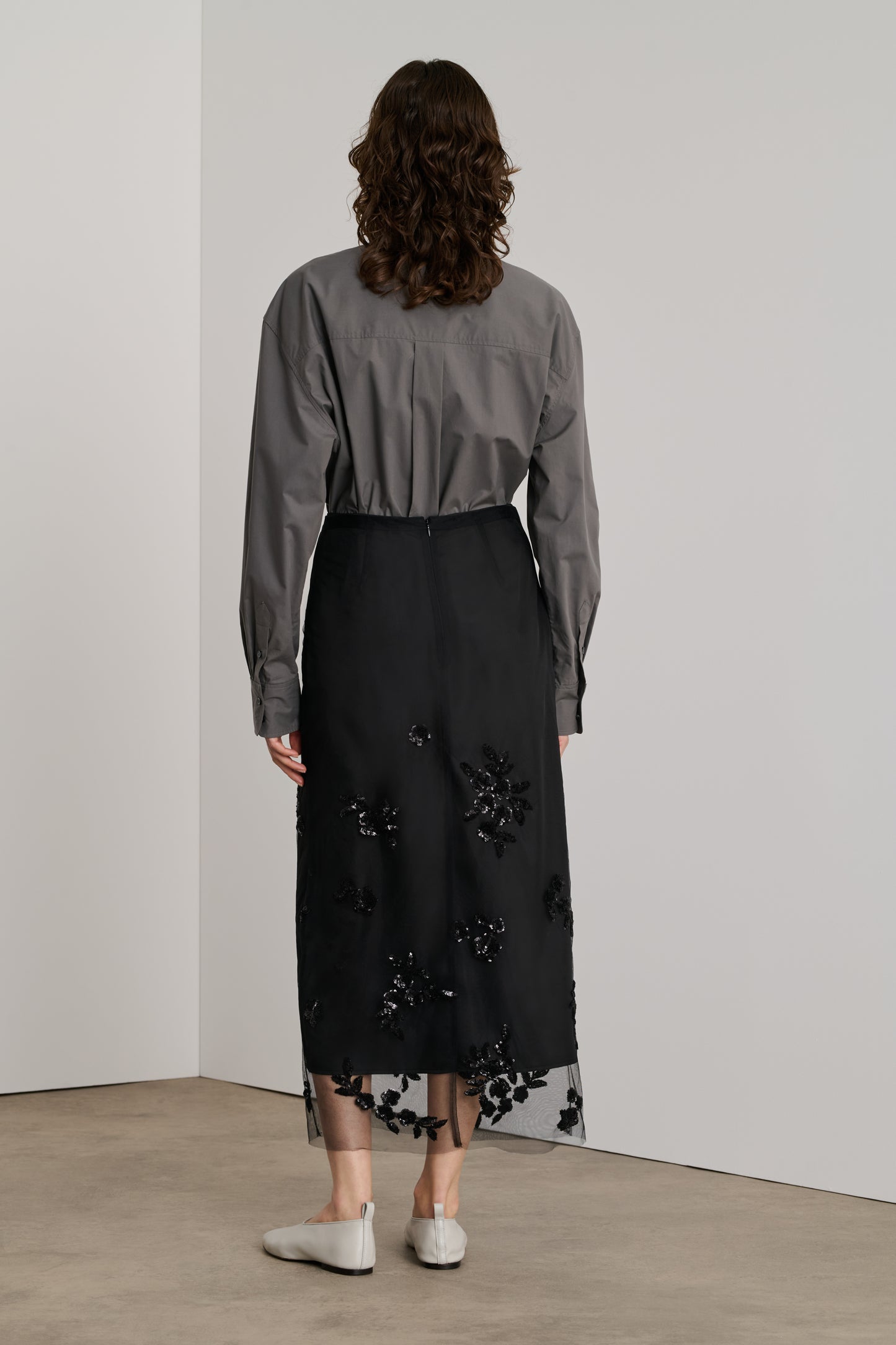 GRACE es una elegante falda larga de tul y apliques bordados. Se compone de dos partes: una enagua forrada para limitar las transparencias y una falda de tul negro bordada de abajo arriba con elementos florales de lentejuelas negras. Se cierra con dos cremalleras invisibles. Esta falda versátil se puede llevar con o sin su enagua, según lo atrevida que seas.