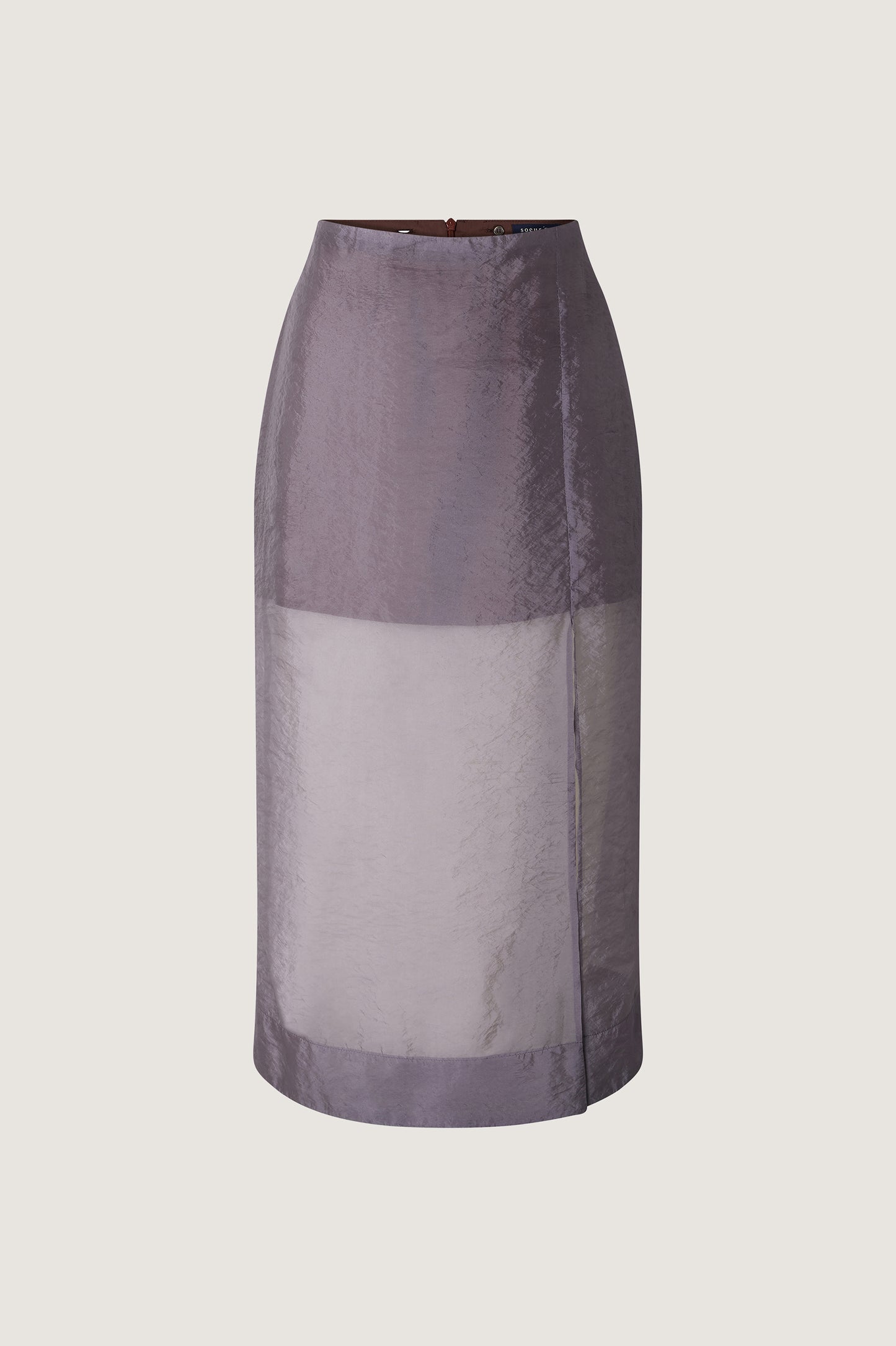 Falda de largo medio con abertura lateral en organza gris, la adición de costuras inglesas en el exterior del tejido añade estructura a este diseño vaporoso.