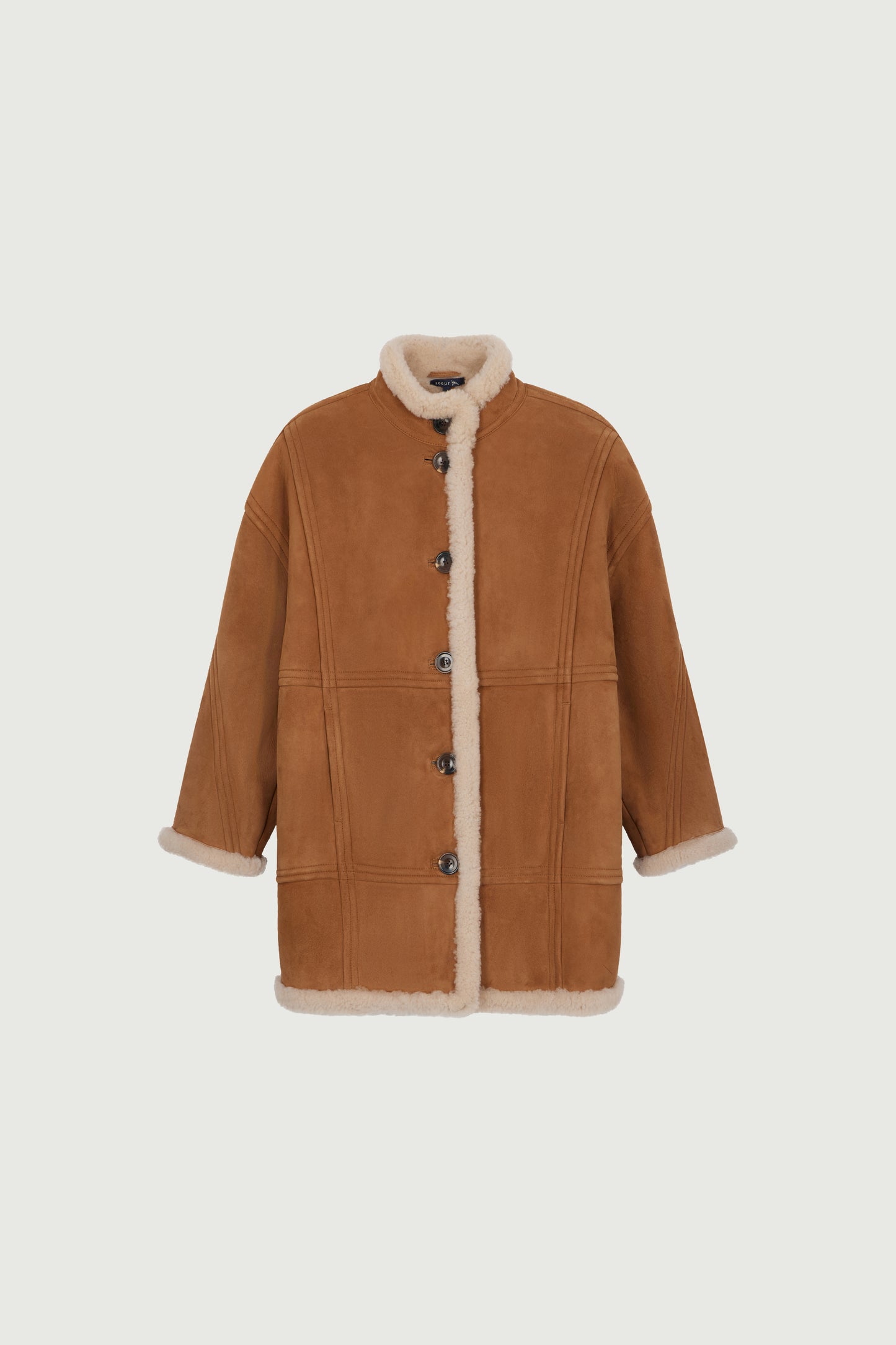 VERBIER es un abrigo de piel de oveja. Los amplios paneles remarcados por pespuntes añaden relieve a este abrigo clásico y atemporal. Los bolsillos ocultos en la parte delantera acentúan su estilo oversize y desenfadado.