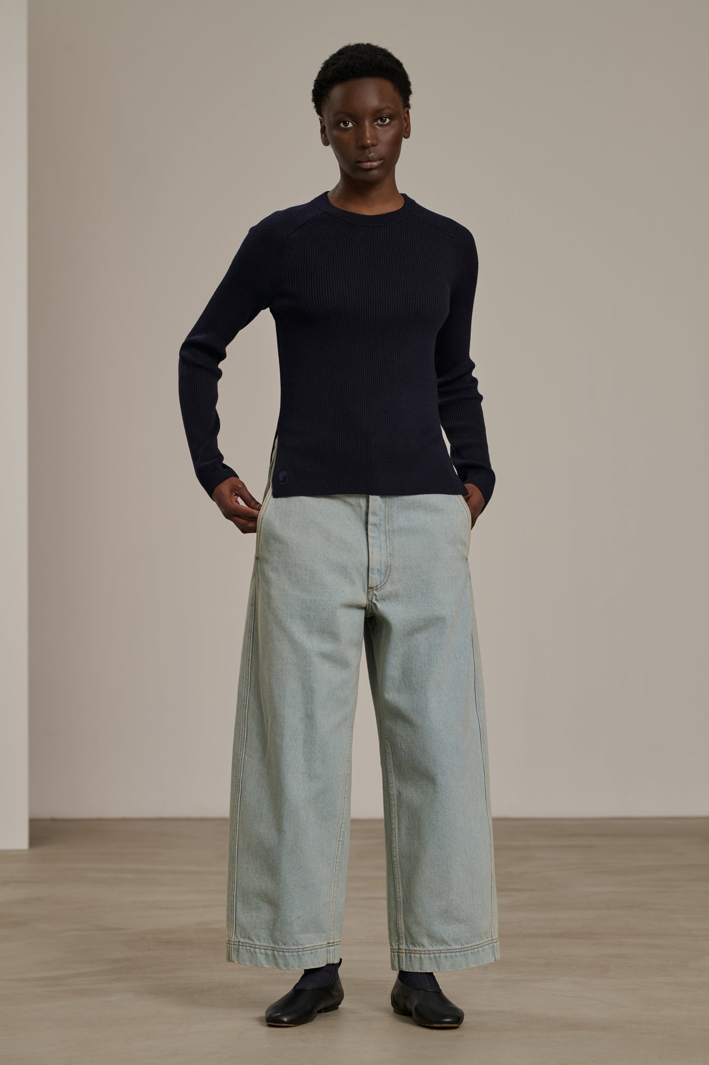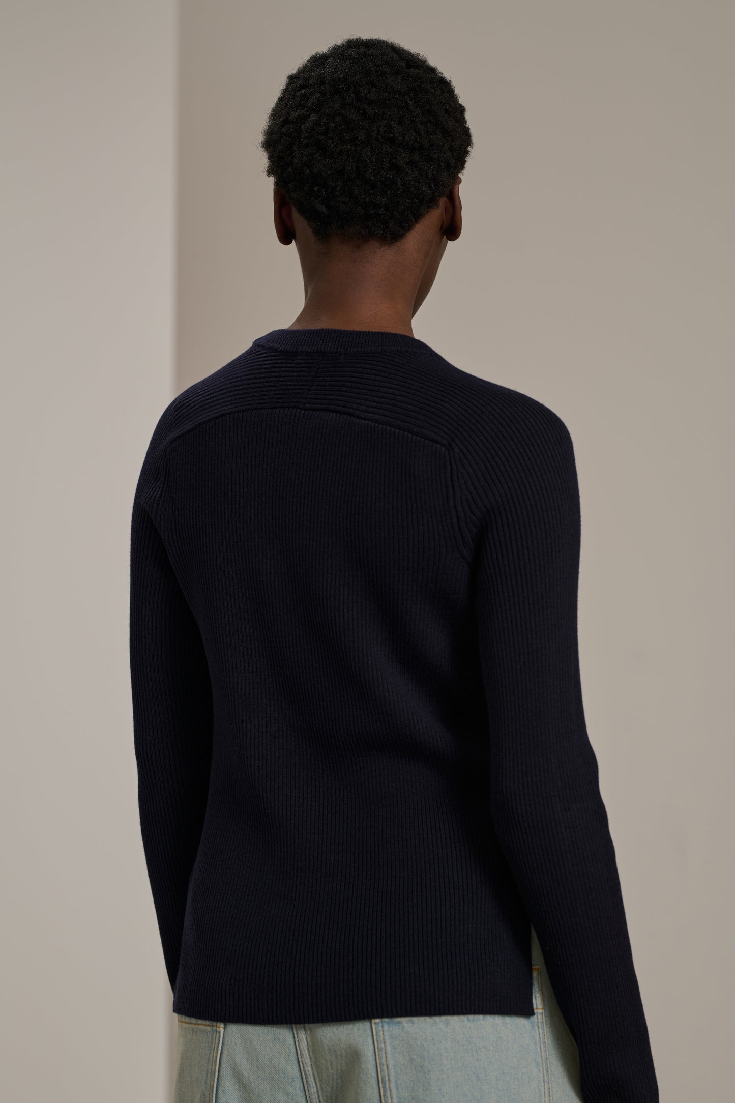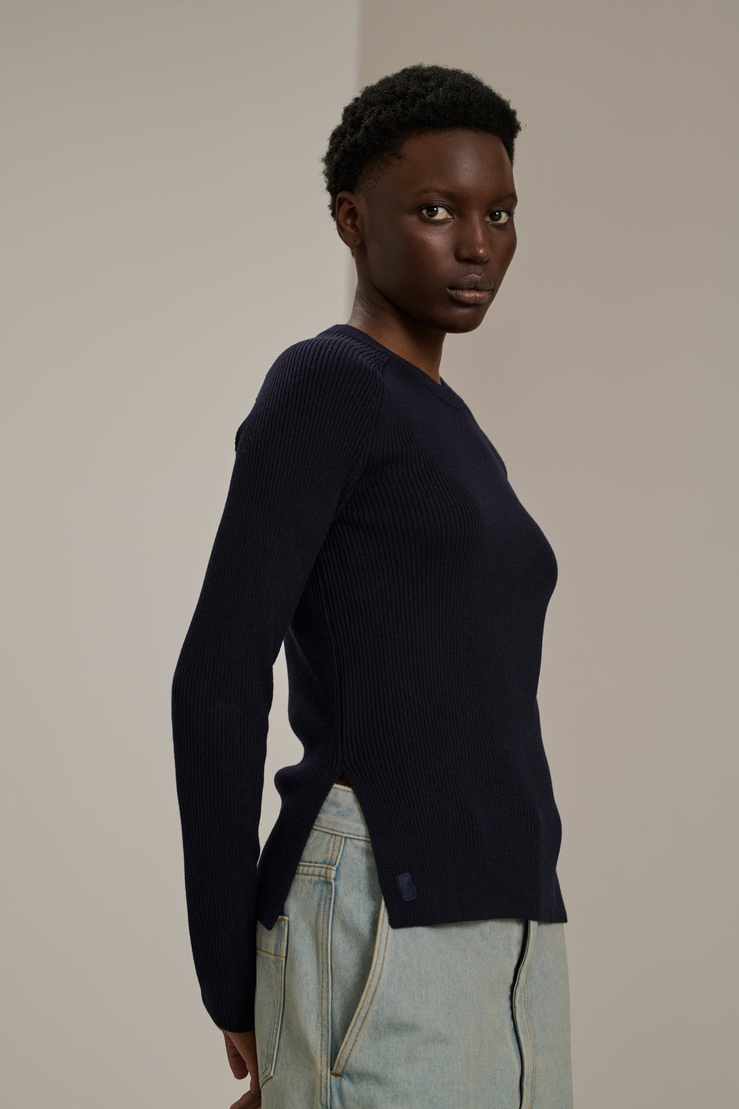 VERONA es un jersey de lana merino de mangas largas, ajustado al cuerpo, con un tejido de efecto acanalado. Se distingue por sus aberturas en los laterales que aportan un toque moderno a su corte clásico. Adornado con nuestra firma en tono sobre tono, es un intemporal que combina elegancia y confort.