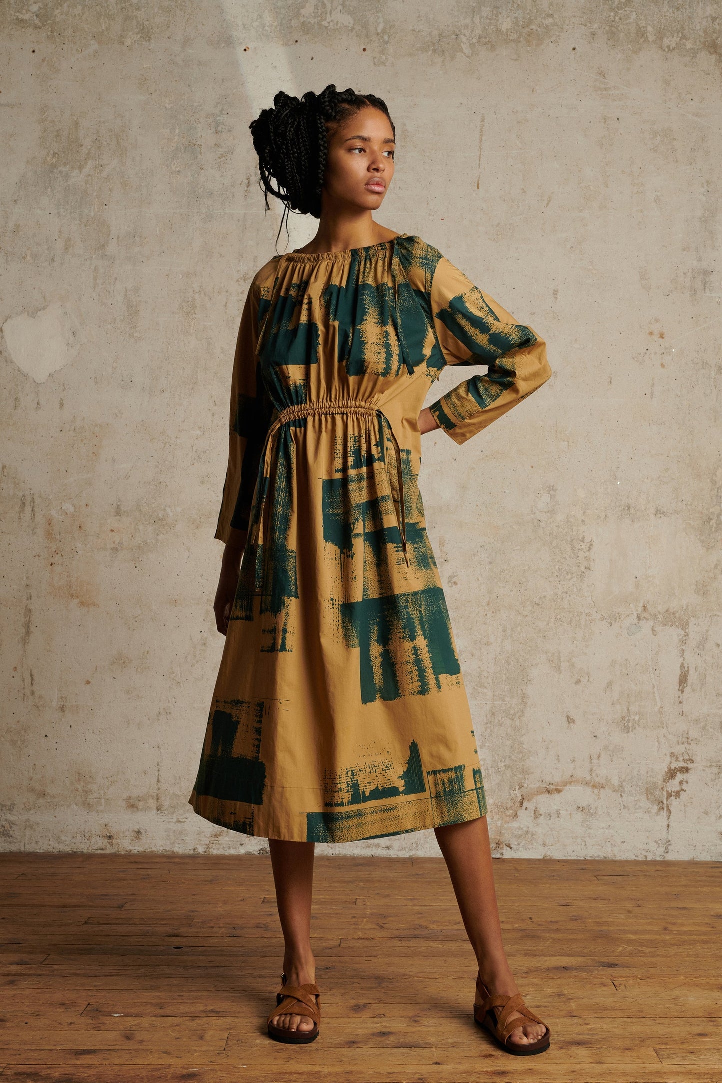 Vestido de popelina de algodón estampado en azul y beige estampado beige