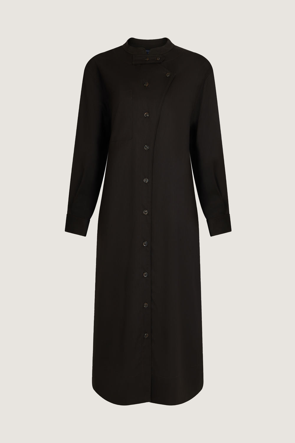 Vestido de gabardina de lana ligera - Vestido largo y volumen recto, se puede llevar con o sin cinturón- Escote redondo- Abertura abotonada asimétrica delante- Tira de ajuste en el escote- Manga larga con puño de camisa abotonado- Un bolsillo de parche en el pecho- Bolsillos insertados en las costuras laterales