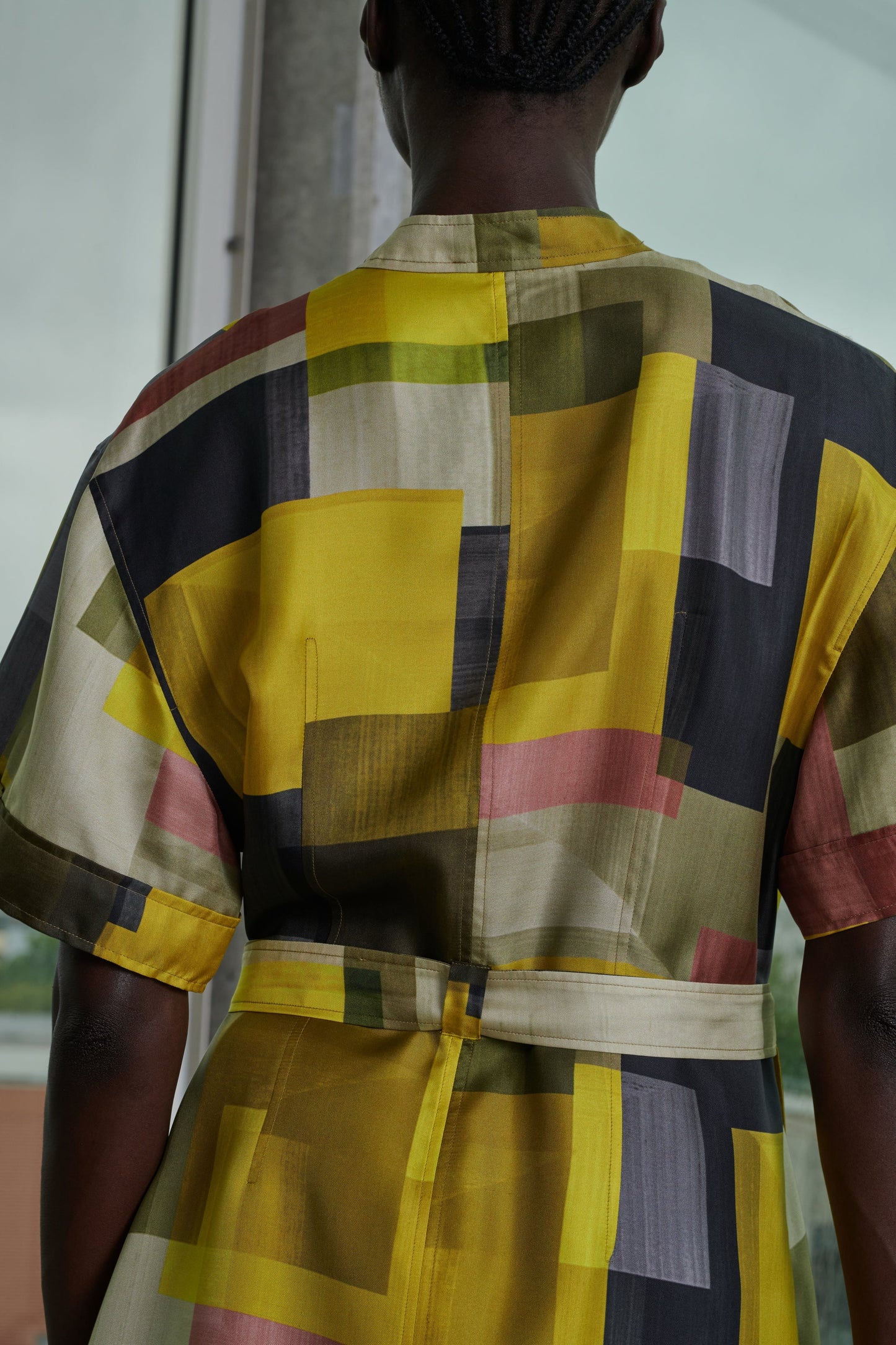 Vestido corto de sarga de seda estampada amarillo/caqui