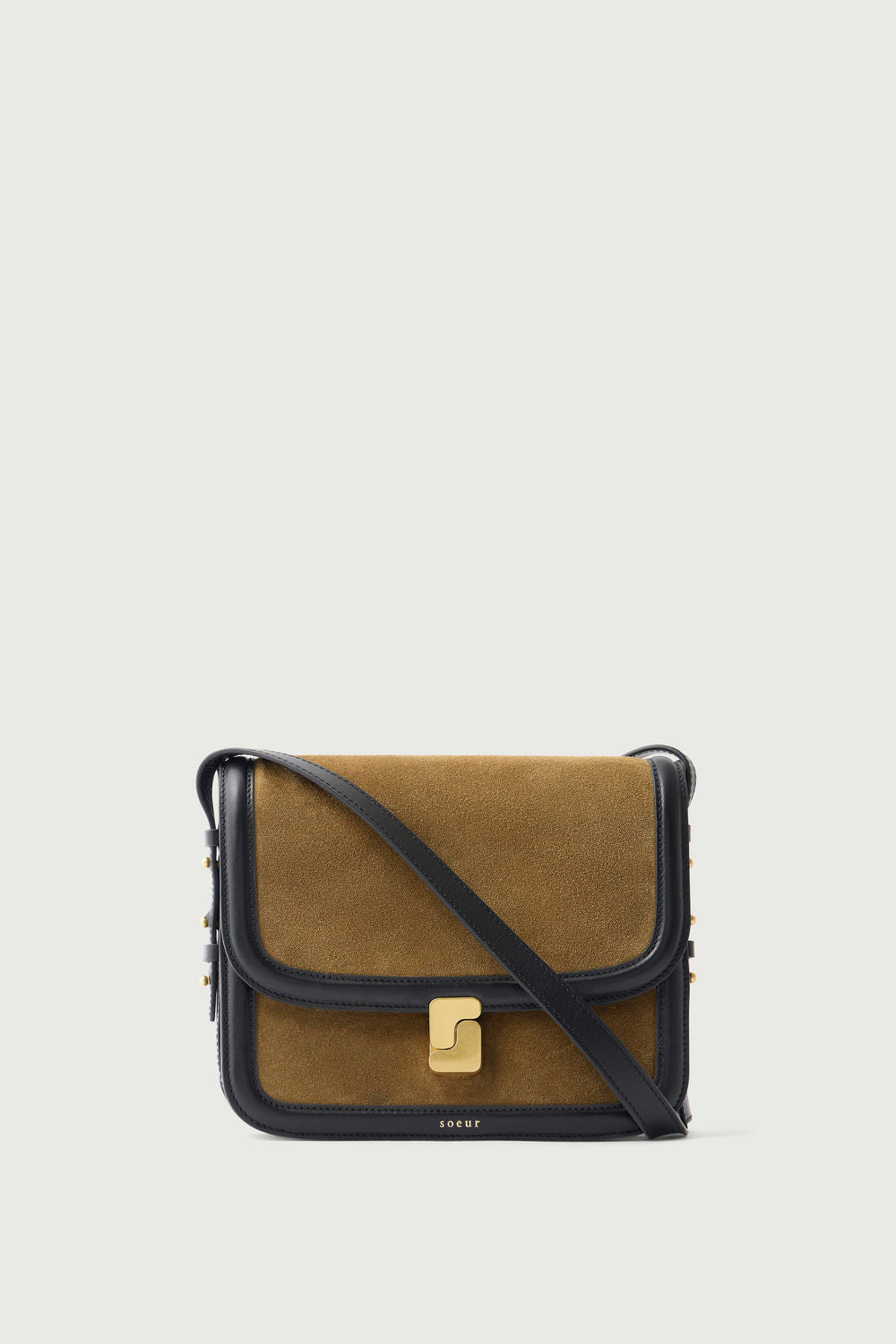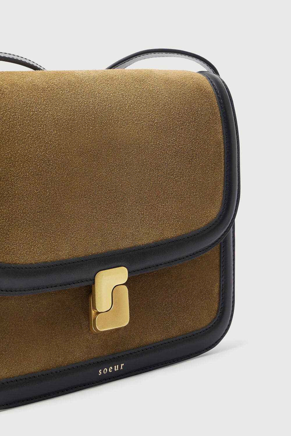 - Gran solapa frontal con cierre de monograma dorado